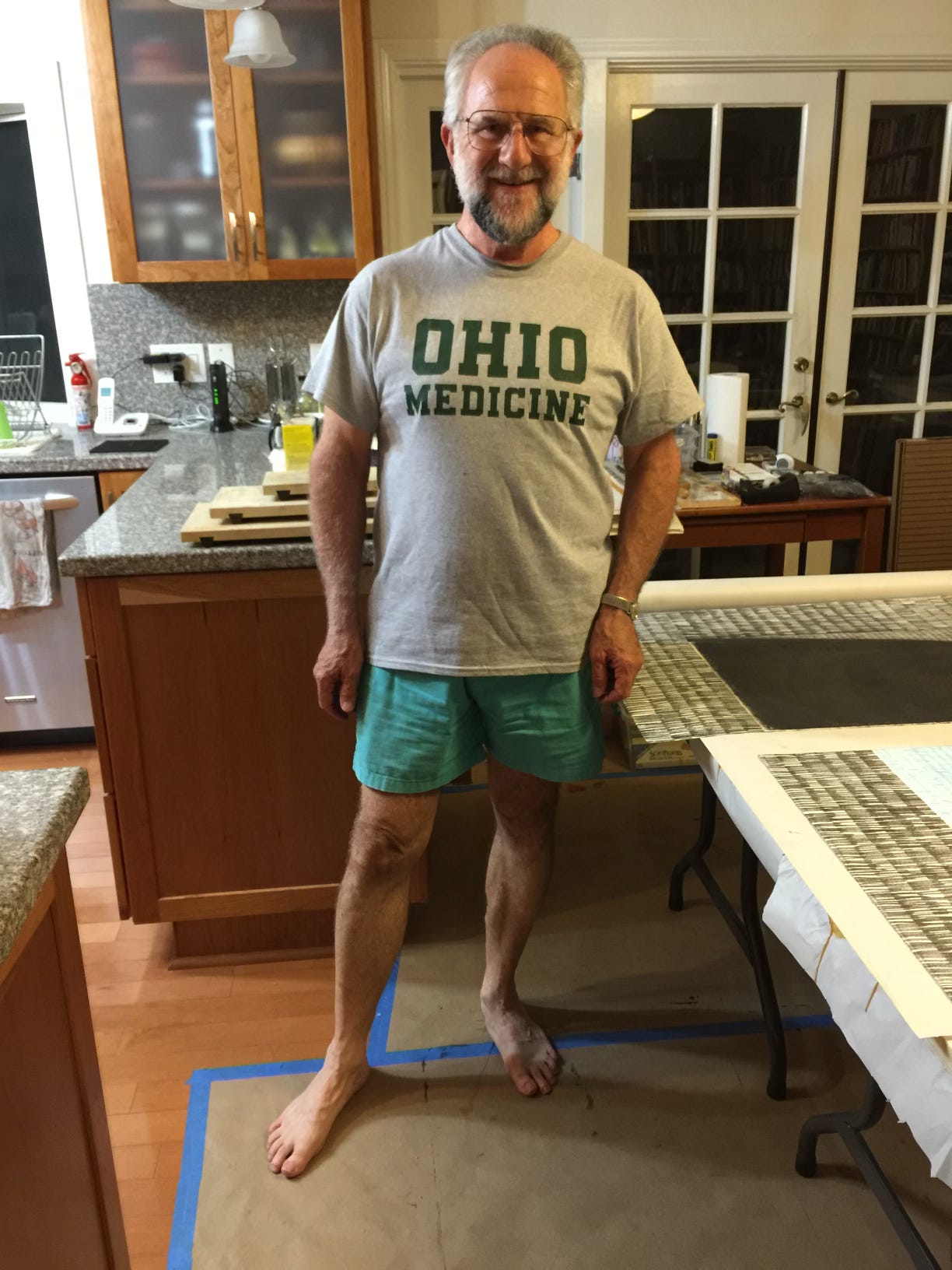 His pants are on (rare), but his denim shirt is unbuttoned (normal); he’s shoeless, which is just as well since we’re in the living room and the wood floor is as smooth as a ballroom. (We put this floor in after a school friend of mine, sliding across the original wood flooring, jammed a shard of wood the size of bear claw into the nail his big toe). I stand at the kitchen counter – I am in the room, held between the memory of Mike’s toe and the present of my father making art – and I watch.